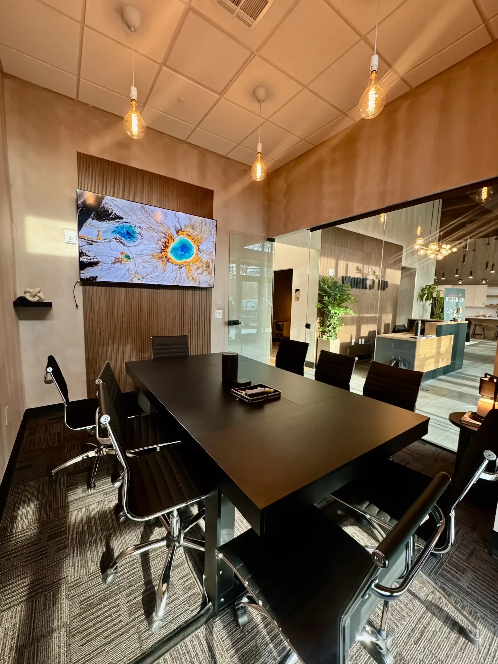 Our conference room offers everything you need for productive, polished meetings. Designed with a clean, modern aesthetic, the space includes a large display, seamless video conferencing, comfortable seating, and a private professional environment ideal for client presentations, team sessions, or virtual calls.